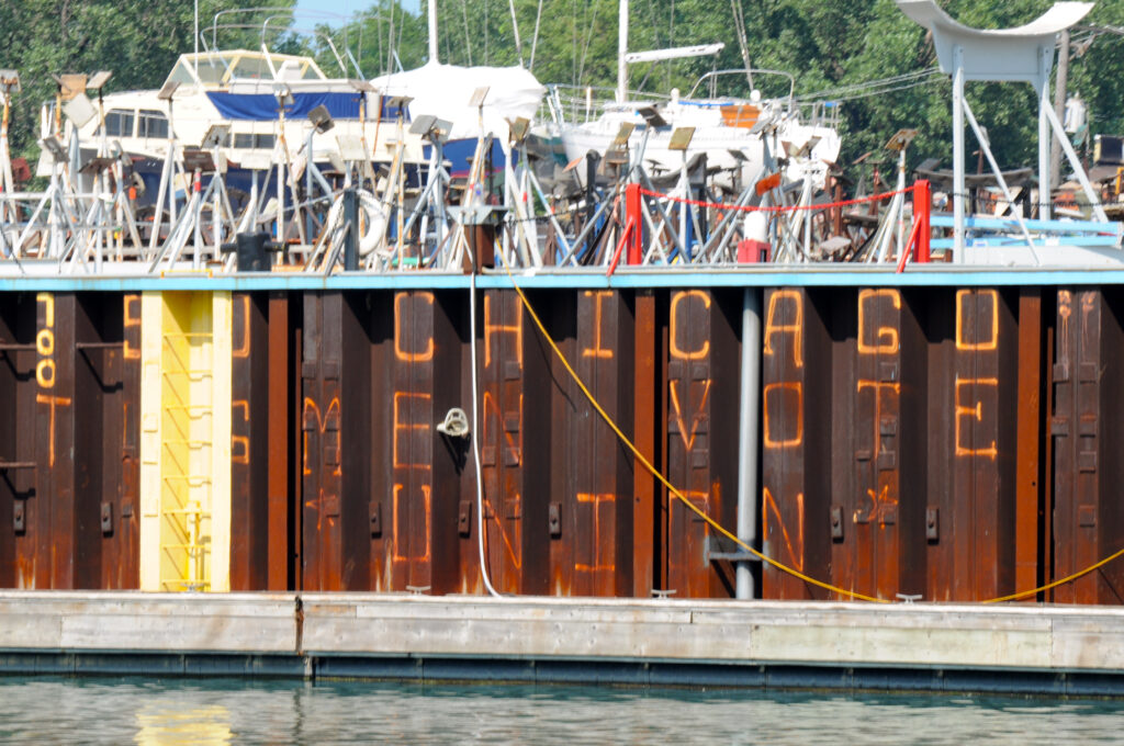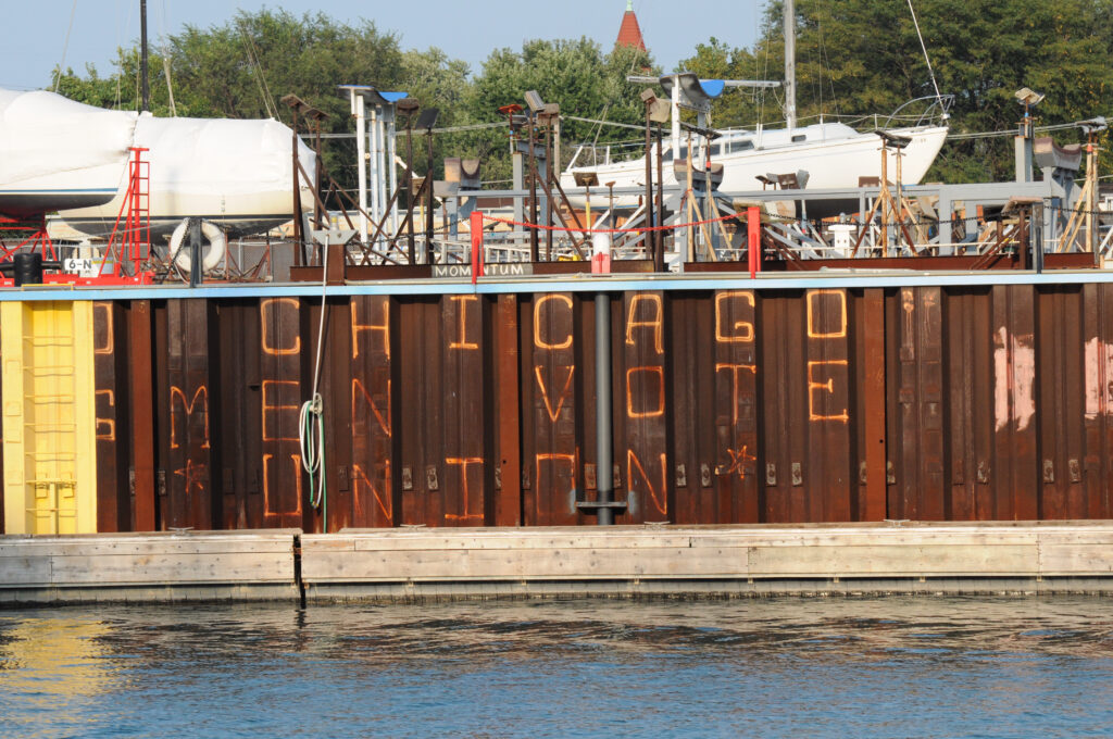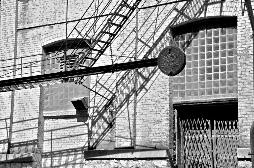 There isn’t a whole lot of information about Hanke Iron & Wire Works on the web now, and it felt like there was actually more when I took this photo back in ’09. It seemed to be most active in Chicago in the first couple of decades of the 20th century, but I remember seeing mention of a relocation toward the end of the company’s existence. A cider house a few blocks from my apartment mentions that there was a similar counterweight on its building in 2015, when it took over that building. There isn’t much more info than that now.