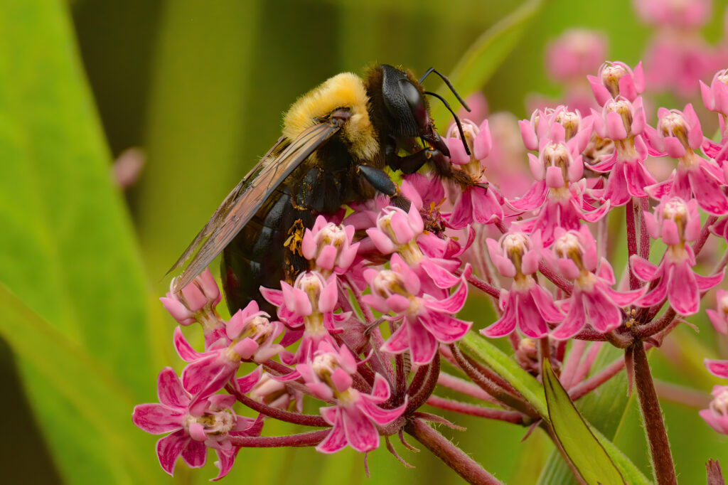 A carpenter bee pauses for a moment in the Summer afternoon sun for a sip of nectar from a milkweed flower. Along with being a good capture of a moment in nature, the photo has a nice mix of colors and the depth of field is sharp across everything that matters and still pushes the nearby foliage into the background.
