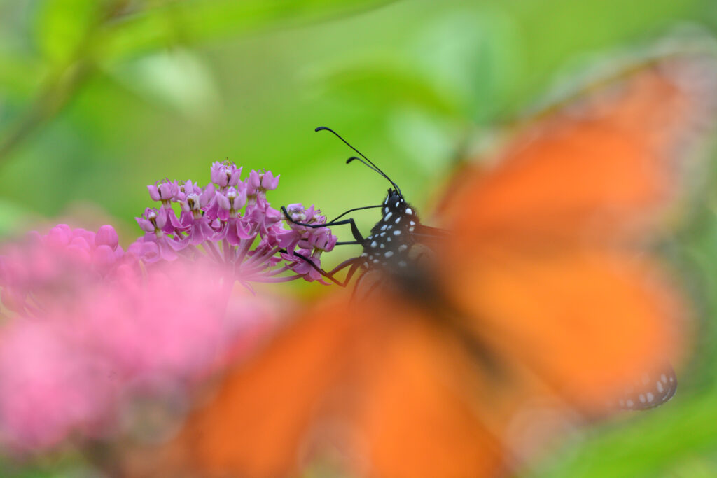 I love this photo because I spent a moment focusing on and composing and setting the shot of that butterfly that’s in good focus in the back, and just as I was pressing the shutter button, another monarch landed on that nearer milkweed flower and got in the way. Thanks to my aperture setting and lens choice, the nearby butterfly was defocused really nicely and it turned out to be a perfect accident.