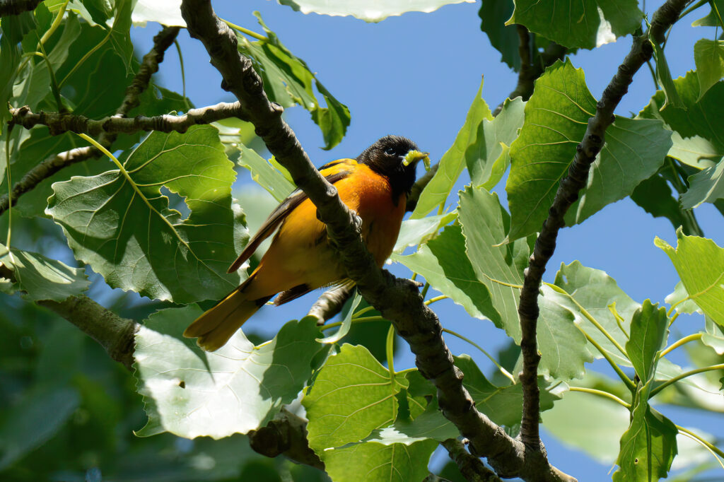 One day in Spring of 2019, an oriole landed on a nearby branch with its next snack, a tiny caterpillar. As the oriole pondered how to fit this horizontal treat into its vertical beak, it moved its little head around, giving me a few angles that showed off the crawlie this way and that, and this was the best of them.