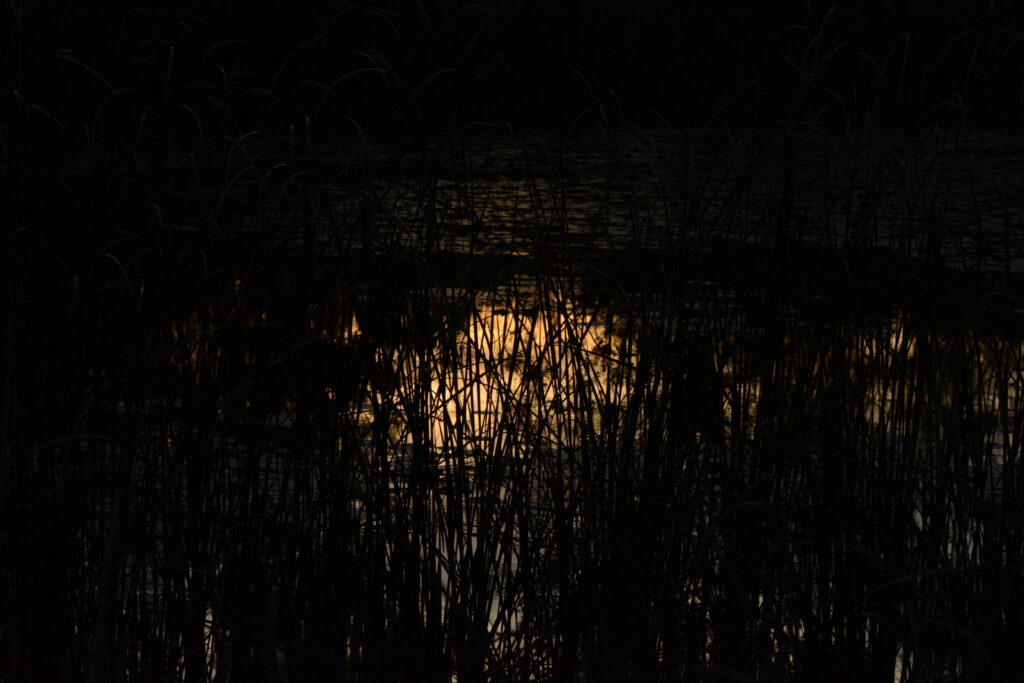 Dusk reflected in the pond at the nature preserve through Fall reeds lets through some warm color.