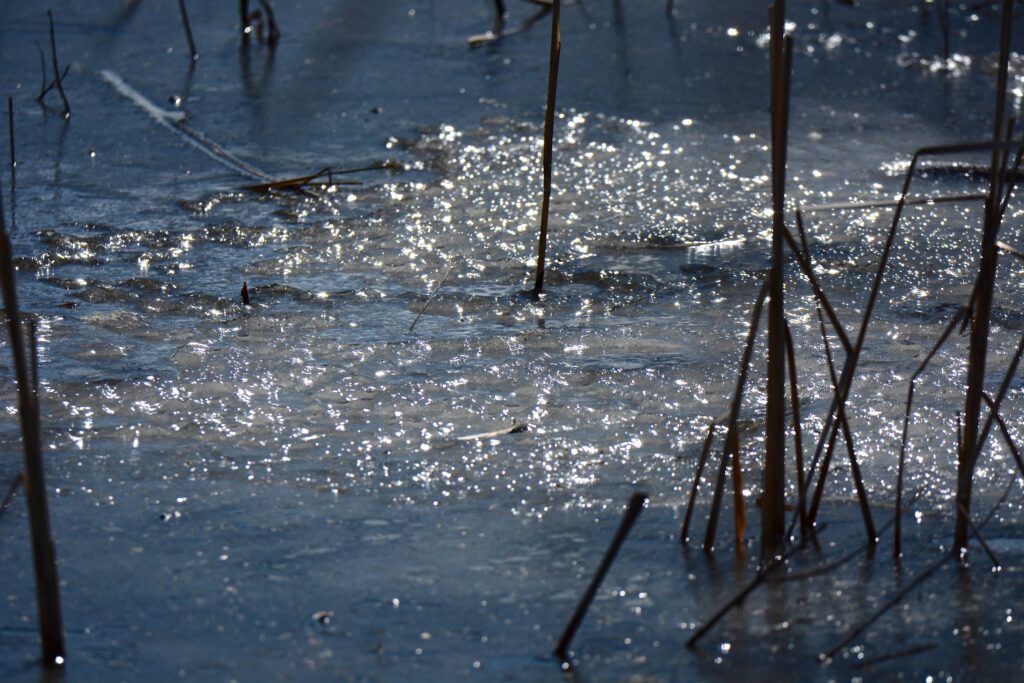 In mid-March in Chicago, there’s still plenty of ice. I loved how the sun caught the texture on the ice, especially around the reeds. It’s thin ice; there’s all water under that skin. But I do like a good texture, and the bubbles and the waves caught frozen create plenty of texture.