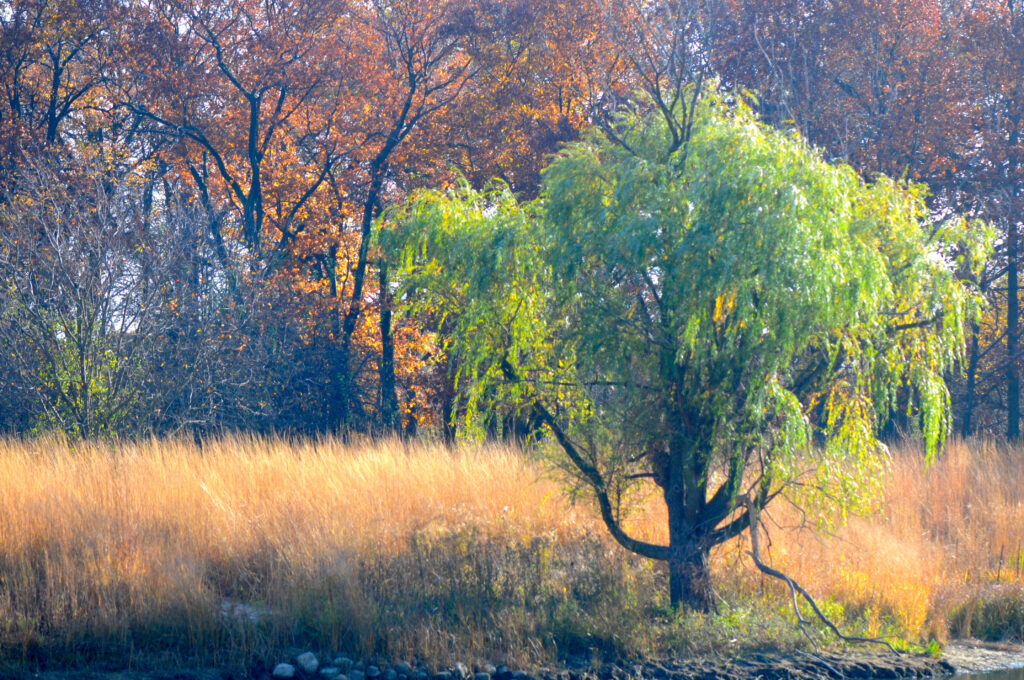 After I moved from my point-and-shoot camera to my first DSLR, and got a really good lens for it, this was the first photo I ever flat-out loved. I have loved willow trees since childhood, when I’d read under one in its shade on warm Summer days. And here’s one at the nature preserve, on the edge of its pond, keeping its bright green color as the world around it falls into the muddy brown that Chicagoans think of as Fall. The sun is low enough already to give us that great light, and this is another example of the macro lens, designed for closeup photography, just working with the scene to give us some gorgeous color and light and shade. I take credit for the composition and the camera settings it took to capture this, and not much more.