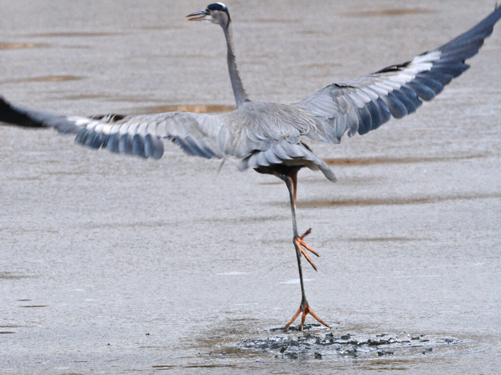 Have I mentioned how much I love to see, and photograph, herons when they look a little silly or awkward or goofy? Here’s one just about to take off. Unfortunately, it’s going in the other direction from me, but that might be what makes this photo work. Look at that ice: As scrawny as those feet are, they still melted it, and he realized that just in time to realize he had to GTFO. One foot’s dangling there, the other’s desperately trying to find enough purchase to get traction, the beak is just agape enough to suggest the word he might be squawking.