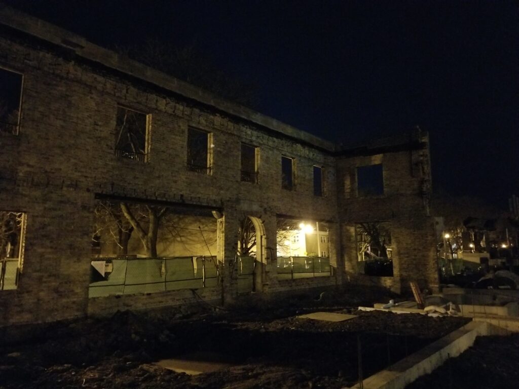This facade was around the corner from the neighborhood bar I’d go to when I was too lazy to cook. Being lazy paid off this night. I didn’t give much thought to the facade as I walked past it and around the corner to the bar. But leaving the bar — that’s when I saw this. This is cool. At 10 p.m. in this light, it was the kind of view we rarely get to see of a building. This was the entire preservation effort; there’s now a three-story modern building behind it, mostly hidden, as if everyone knew this original facade was really what everyone wanted to see anyway. This was one of those moments I felt like I was lucky to be in the right place at the right time.