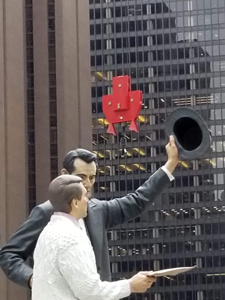 Here’s another scene that stopped me in my tracks. For some years, the large plaza across the street from the office building I worked in had a series of advertising statues. They were dumb and garish and tacky.