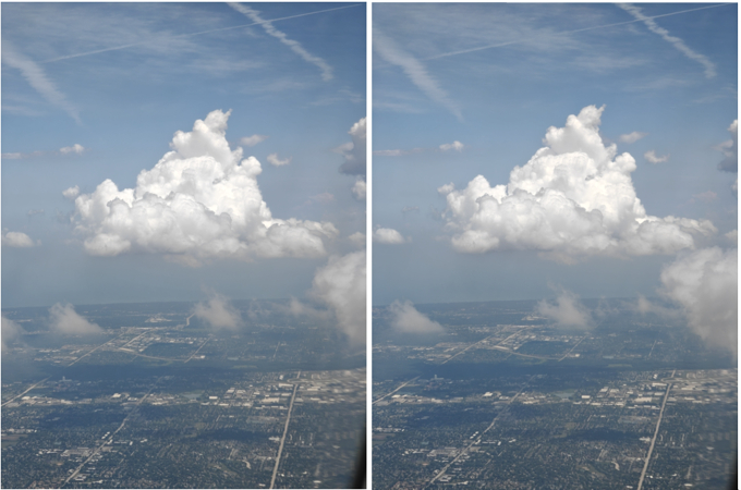 The layers of depth are remarkable. Those little puffs are right up front; that nice big fluffy cloud has its own sense of depth. The ground below recedes to the horizon perfectly. A few other clouds float here and there between us and those contrails in the distance. (The contrails and the cirrus clouds are too far away to show up in 3D.)