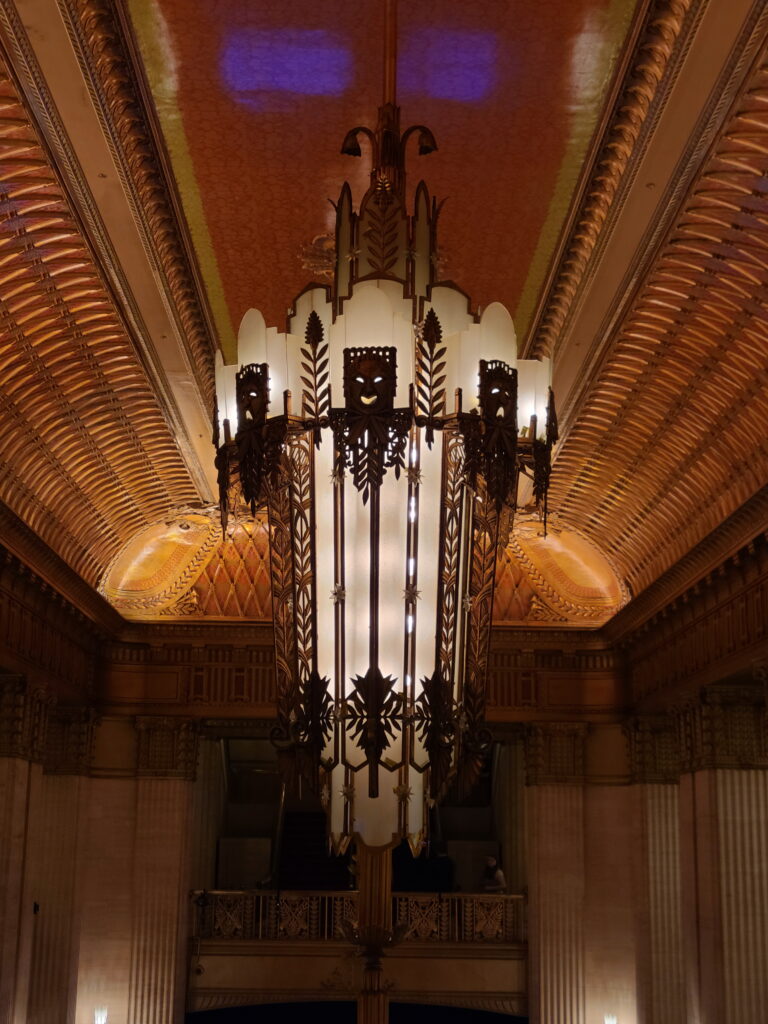 The Civic Opera Building in Chicago, designed by a whole lot of architects, is a mostly beautiful building (if you know, you know) dating back to 1929. Like any high-rise building in the Loop, most of the space is devoted to offices, but the Civic Opera House is home to the Lyric Opera of Chicago. The art deco interior is fabulous, worth going there to see it, and if you’re at the right landing to get a photo of the amazing chandeliers, you may end up with something like this, because they are that beautiful and wry. Yes, I said “wry.”