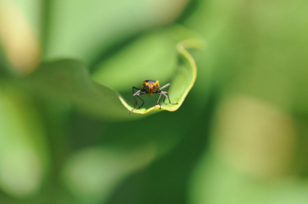 I like milkweed bugs a lot. They’re not much bigger than a grain of rice and tend to be found in swarms, drinking up the milky sap that gives the milkweed plant (and the bugs) the name. Plus, although there isn’t a lot of room for variety on their tiny backs, they’re decorated with patterns that could be little bug Rorschach tests. Also, considering how itty-bitty they are, they seem to have a smidgen of curiosity. This one marched to the end of a leaf to stare me down, and I’m happy to say that this photo is completely unedited.