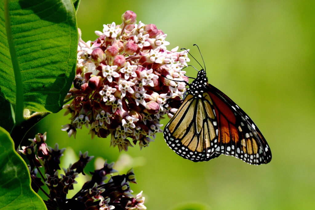 The gorgeous roughness of the leaves anchored in the corners, the amazing folds and velvet of the monarch’s wings, and the pink and cream ball of milkweed flowers in between, with the soft blur of the lush summer green background, make this a photo I really love.