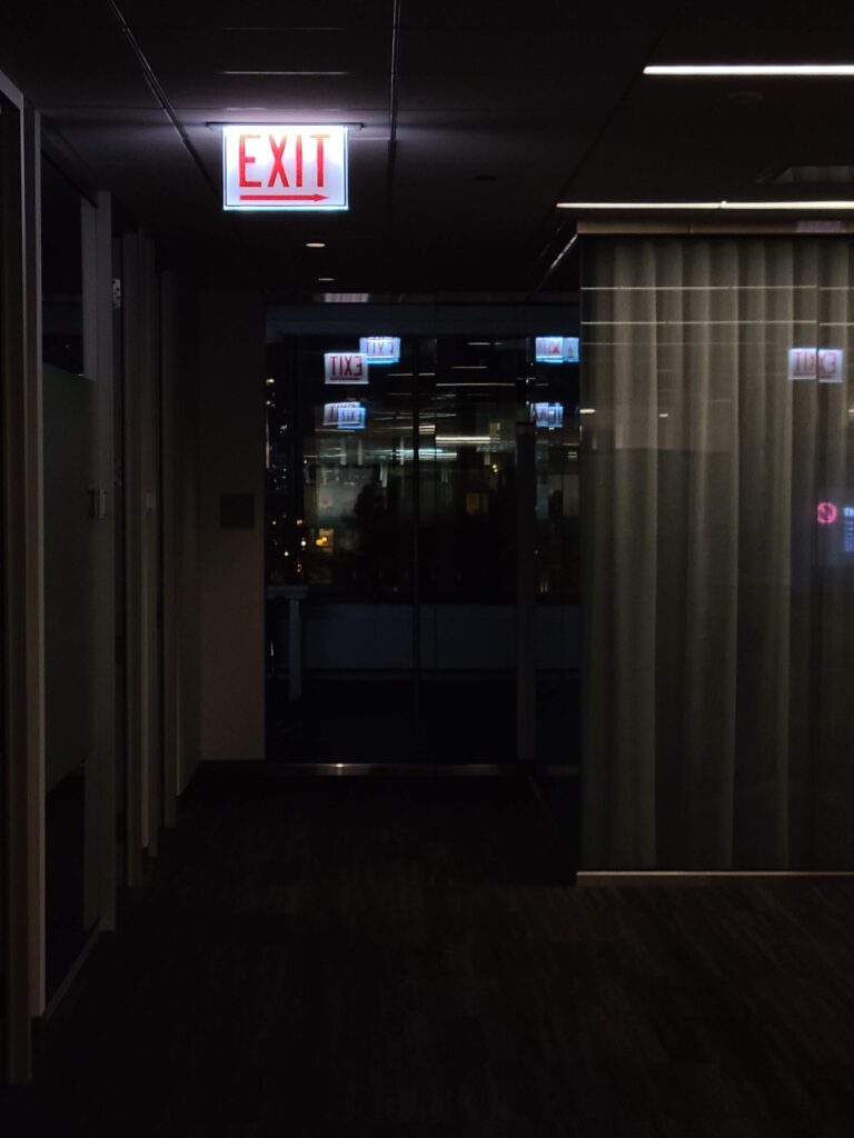 A few years ago, I was in the office for a few minutes after everyone else who had showed up that day had left. During the pandemic, the company had put in both timers and motion detectors, so as I walked down a dark hallway with lots of glass to the sides and at the front, the exit sign bounced around. It’s hard to tell what’s reflecting what. It was a cool effect. Not long after I took this photo, I submitted it along with half a dozen or so others to a very large stock photo agency, which accepted me. I thought it was a natural for either editorial or marketing materials, but, well, I’m still waiting to become an overnight sensation.