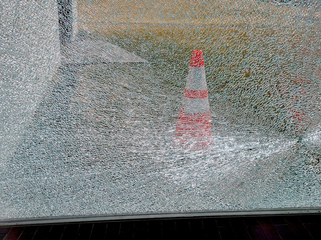 I’m visiting a museum in Minneapolis and, in a hallway, I see that something hit that window hard. I wasn’t there to see that happen, but I was there before they repaired it to see how cool the cracked pattern was, and that cone brings a little more color to the scene. I’ve mentioned my fondness for glass from some of the earliest published photos here, and this was another look at how it acts in the real world.