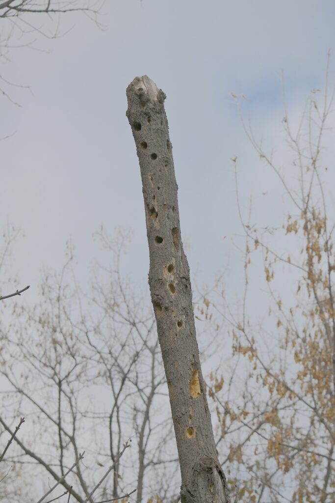 With birds as with people: What looks like the cool new trendy place to live slowly becomes that place that lets everyone in, and the trendsetters move along to some new hot spot. This dead trunk was clearly very popular with woodpeckers for a time — I occasionally saw them very nearby but rarely saw them in these nests — and eventually they just packed up and moved out. Of course, they make their own housing, so once a trunk they love has become so dead that the insects they love have moved on, they can move on too.