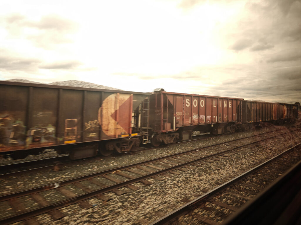 Here’s another photo taken from my seat on an Amtrak train outside of St. Paul. I was using my cell phone in manual mode, which it turns out is a pretty decent camera (and gives me a live preview so I know exactly what I’m getting), and while I wish the bright overcast clouds hadn’t blown out, I’m happy with the blur on the left thanks to the proximity of that side and the sharpness of the rest of the train and tracks. Another nice shot of what I would have thought was a scene you wouldn’t be able to see anymore.