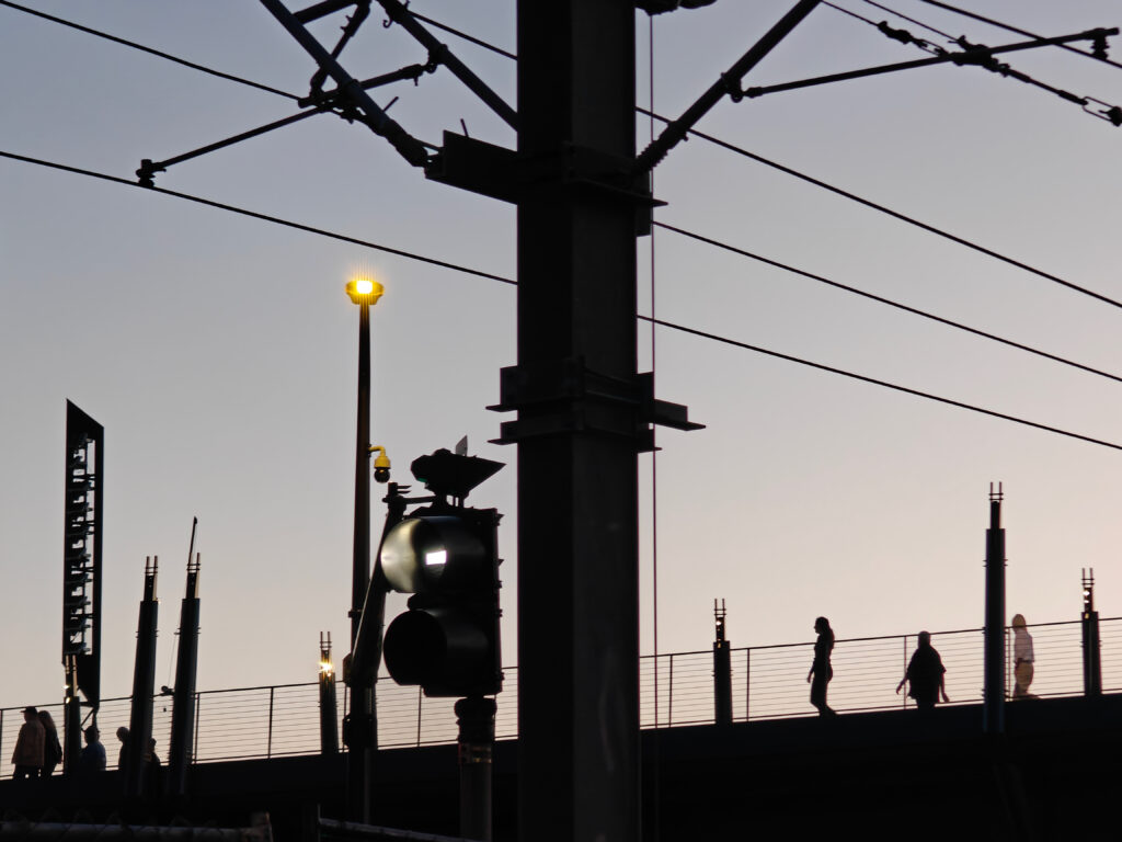 My friend and I are in downtown Minneapolis at dusk for a concert, and as we approach the entrance from ground level, I see a bridge one story up with folks strolling toward the venue amid some lights. The shapes of the silhouettes of the lights, power lines, and people really caught my eye.
