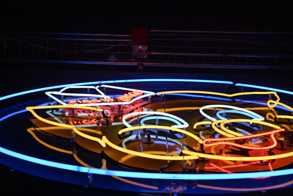 Today we’re back to the neon sign museum hidden behind locked doors that I got access to as part of a promotional event by Nikon. I took a couple of photos of this Piggly Wiggly sign from far enough away that you could see the sign reasonably normally, but once I realized there was a reflective surface behind it, I liked the idea of getting both the sign and its reflection at a sharp angle. It worked nicely, I think, and I like the glow from the blue tube above the sign as well.
