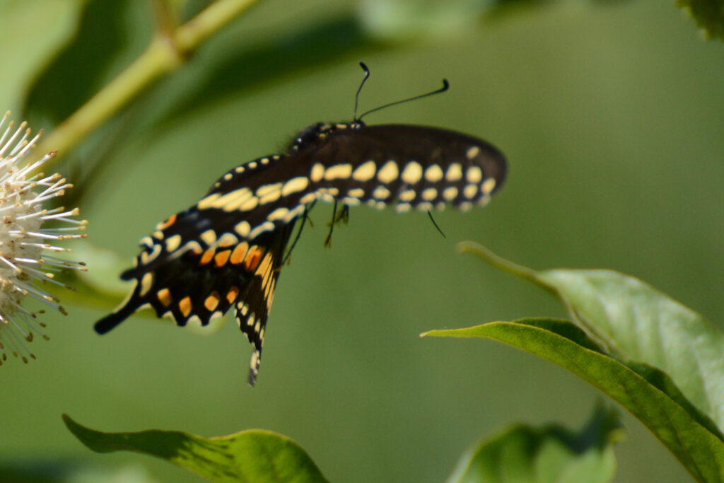 Flying from one buttonbush to the next, a swallowtail butterfly dangles not only its legs but also its long proboscis in anticipation of the nectar on its destination.