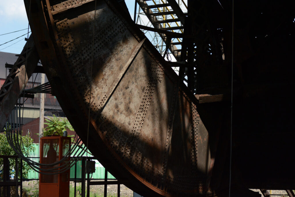 It’s hard to reduce the scale of those bridges, which are immense, to a little photo on a little blog. On my last of those trips, I was happy to see this view of one of the wheels that actually moves all of that metal. Even these wheels — essentially the pulleys that move much of the mechanism — are staggeringly large. They have counterparts atop the structures and at some point, I’ll post one of those, which will lose the sense of scale we see here but show how it all fits together.