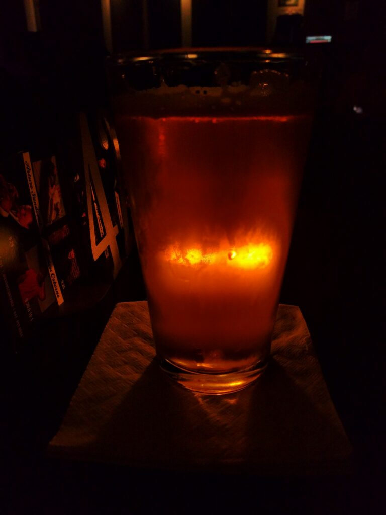 While waiting for a band to hit the stage, I noticed how nicely a candle was backlighting my glass of beer to create a nice ambience photo. Between the white candle, the amber beer, the clear glass, and the condensation, there’s a lot going on in a small space to create that warm glow.