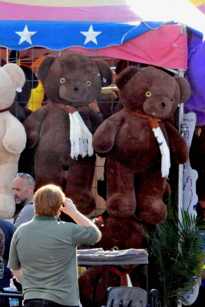 At a state fair, the joy of winning is balanced by the agony of choosing between two all-but-identical prizes. I hope that scarf is machine-washable, because state fair food is going to make its mark on whichever of those big happy bears comes home with him.