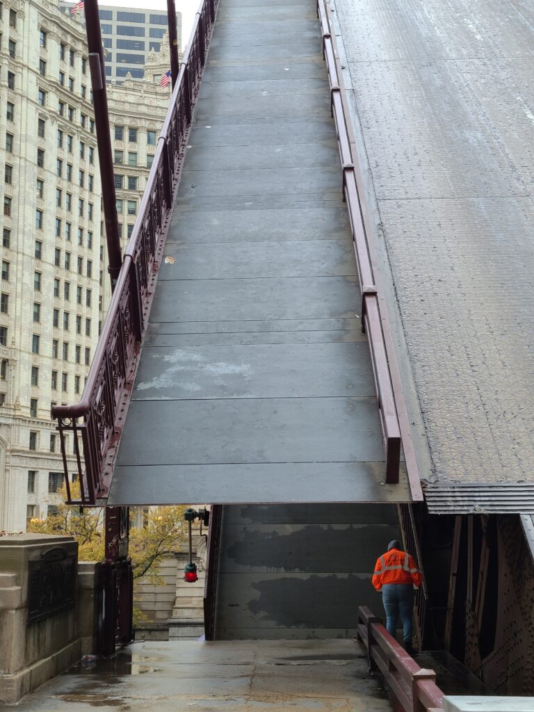 The bridges that cross the Chicago River are all lift bridges, so boats can get from the lake to their harbors or Winter storage or wherever they go when they aren’t out on the lake for a while. The bridges are lifted on a very regular schedule, and if you forget and end up stuck on the wrong side, it sucks to be you, because each disruption is just a little less time than trudging down to the next bridge crossing and going around the one that was annoying you. You may as well just wait it out.